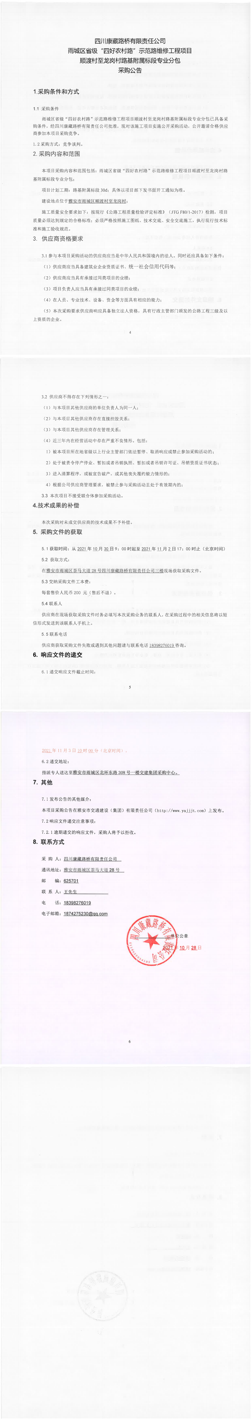 四川康藏路橋有限責(zé)任公司雨城區(qū)省級“四好農(nóng)村路”示范路維修工程項目順渡村至龍崗村路基附屬標(biāo)段專業(yè)分包采購公告