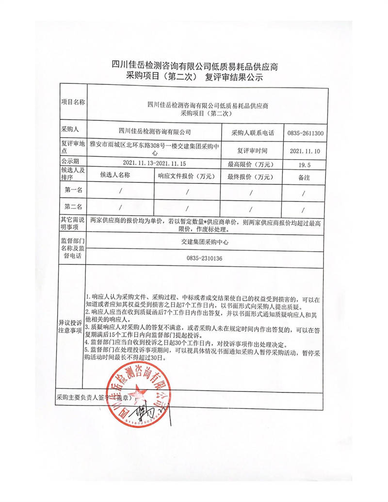 四川佳岳檢測(cè)咨詢有限公司低質(zhì)易耗品供應(yīng)商采購項(xiàng)目(第二次)復(fù)評(píng)審結(jié)果公示