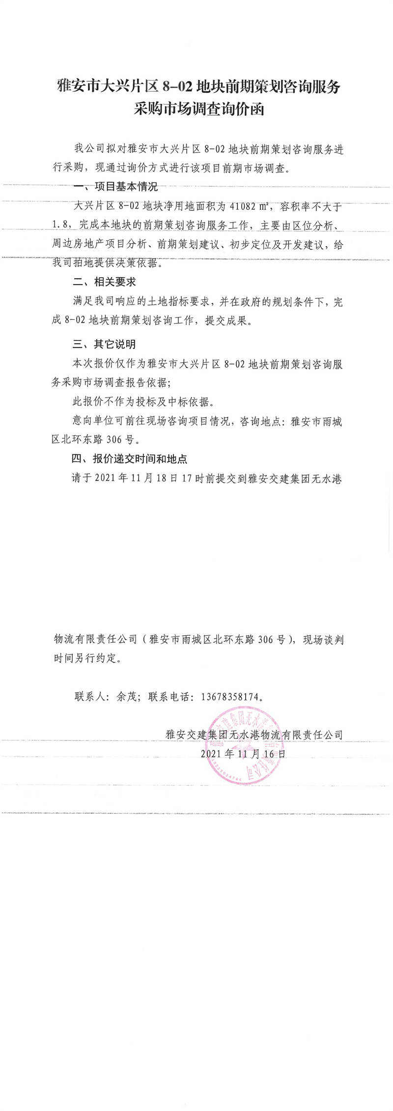 雅安交建集團(tuán)無(wú)水港物流有限責(zé)任公司雅安市大興片區(qū)8-02地塊前期策劃咨詢(xún)服務(wù)采購(gòu)市場(chǎng)調(diào)查詢(xún)價(jià)函