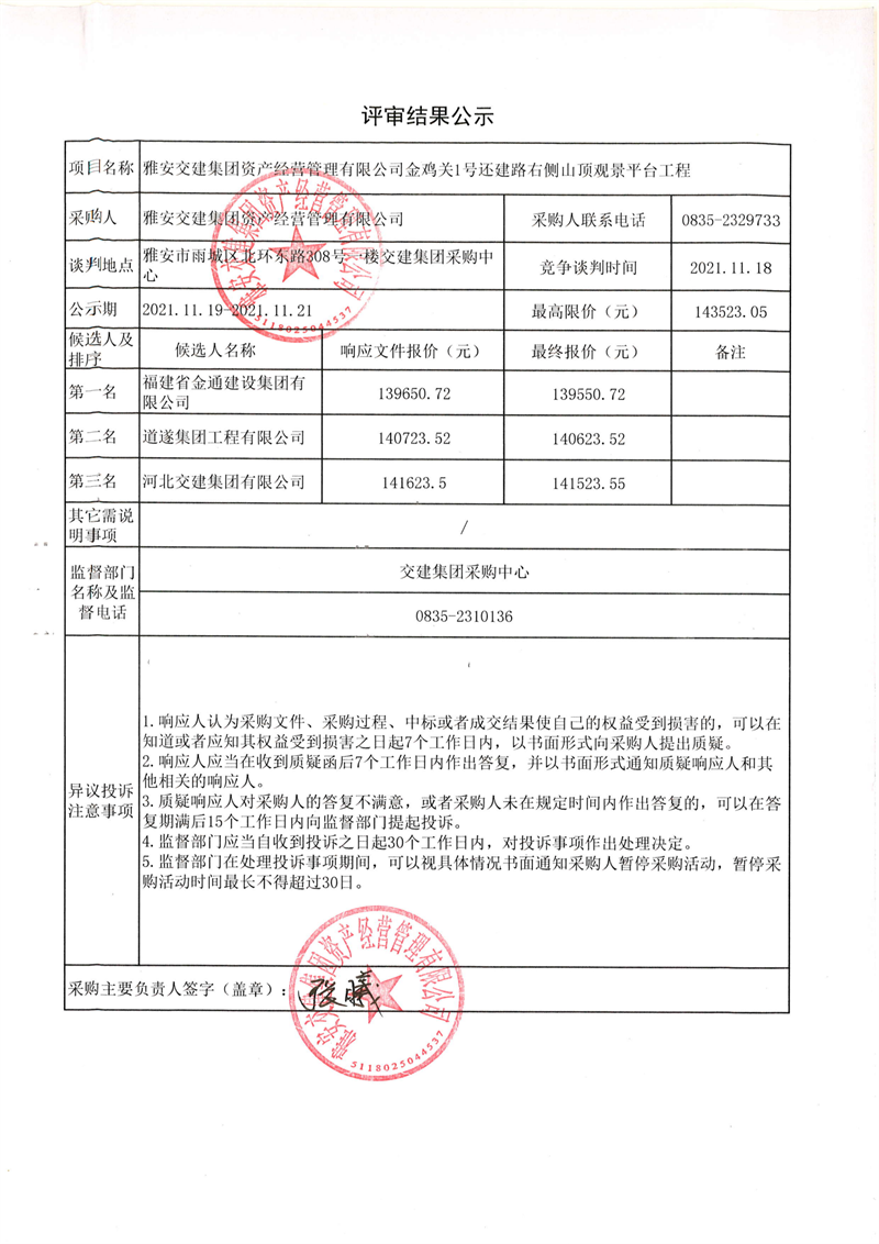 雅安交建集團資產(chǎn)經(jīng)營管理有限公司金雞關(guān)1號還建路右側(cè)山頂觀景平臺工程評審結(jié)果公示
