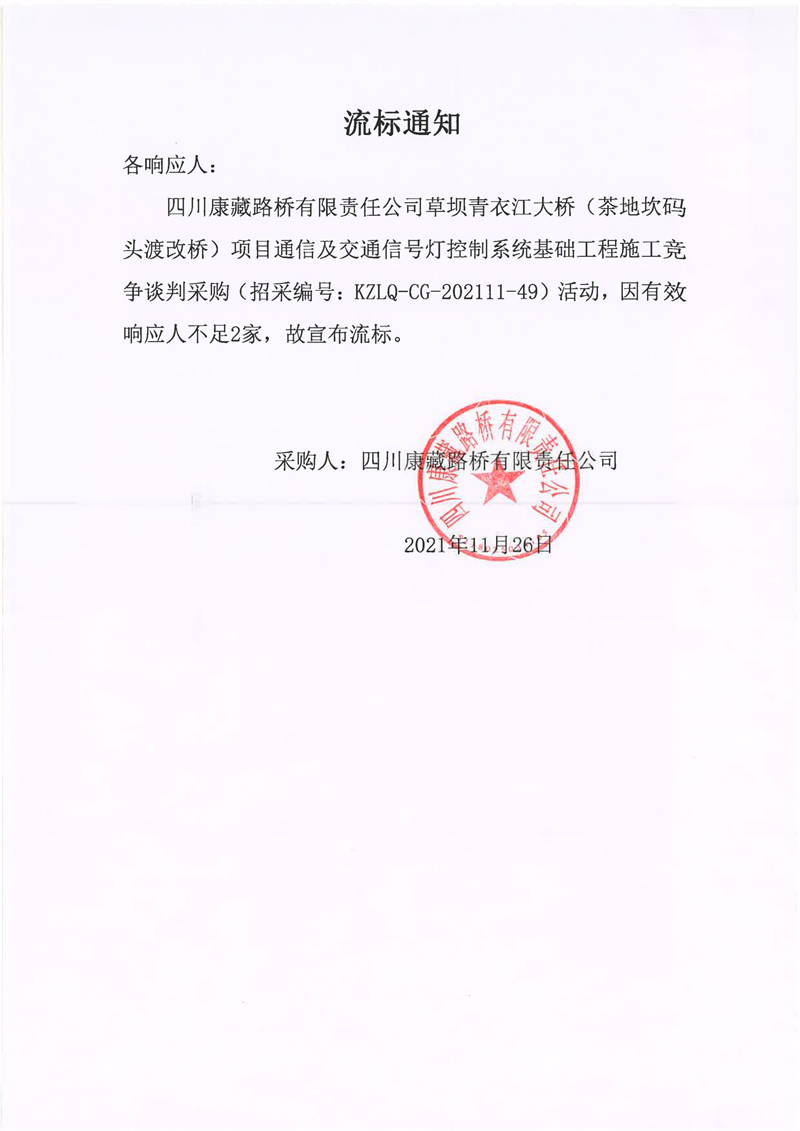 四川康藏路橋有限責(zé)任公司草壩青衣江大橋(茶地坎碼頭渡改橋)項(xiàng)目通信及交通信號(hào)燈控制系統(tǒng)基礎(chǔ)工程施工采購流標(biāo)通知