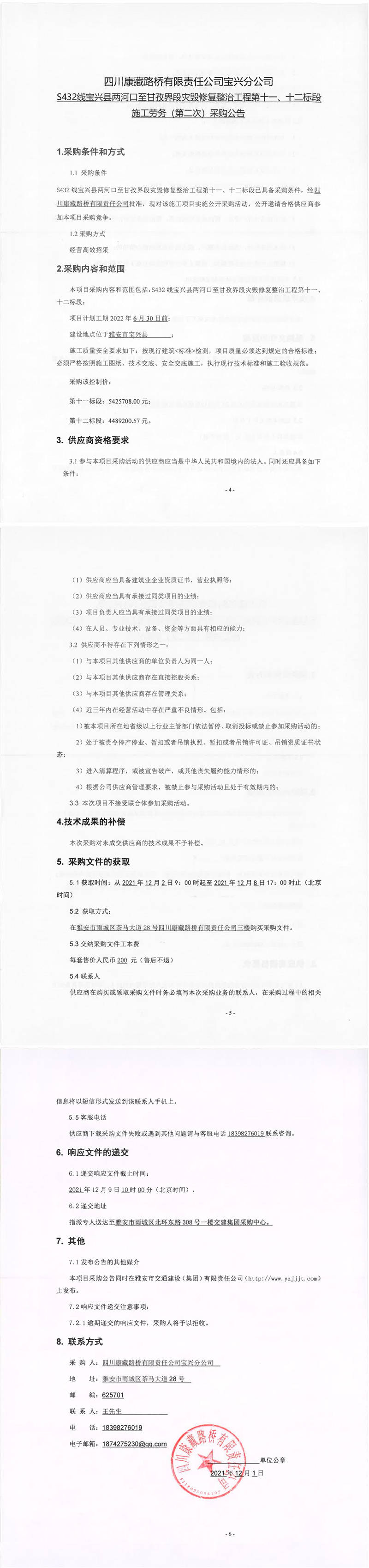 四川康藏路橋有限責任公司S432線寶興縣兩河口至甘孜界段災(zāi)毀修復(fù)整治工程第十一、十二標段施工勞務(wù)(第二次)采購公告