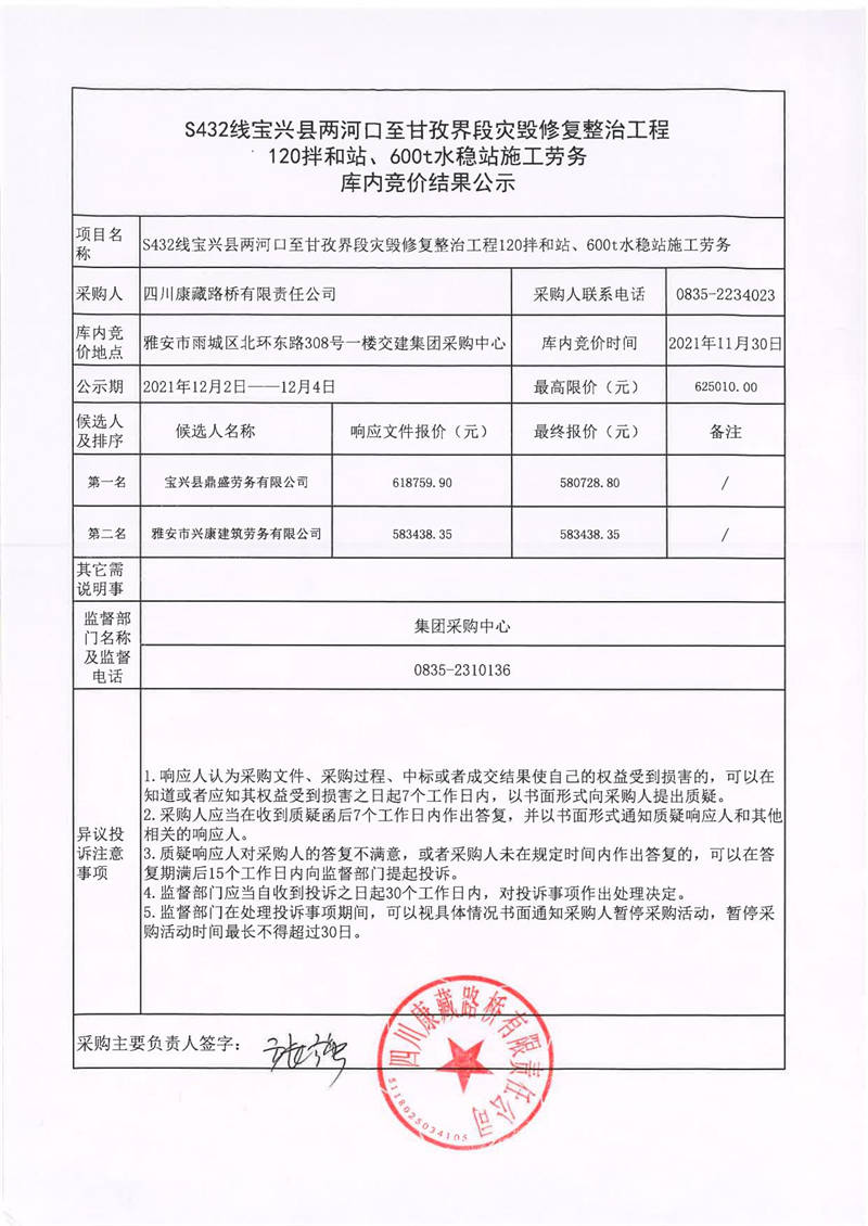 四川康藏路橋有限責(zé)任公司S432線(xiàn)寶興縣兩河口至甘孜界段災(zāi)毀修復(fù)整治工程120拌和站、600t水穩(wěn)站施工勞務(wù)庫(kù)內(nèi)競(jìng)價(jià)結(jié)果公示