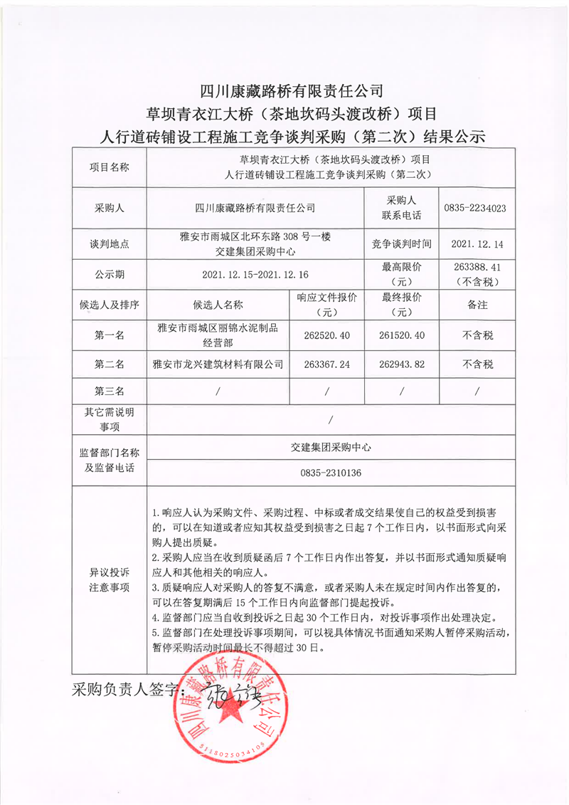 四川康藏路橋有限責任公司草壩青衣江大橋(茶地坎碼頭渡改橋)項目人行道磚鋪設(shè)工程施工競爭談判采購(第二次)結(jié)果公示