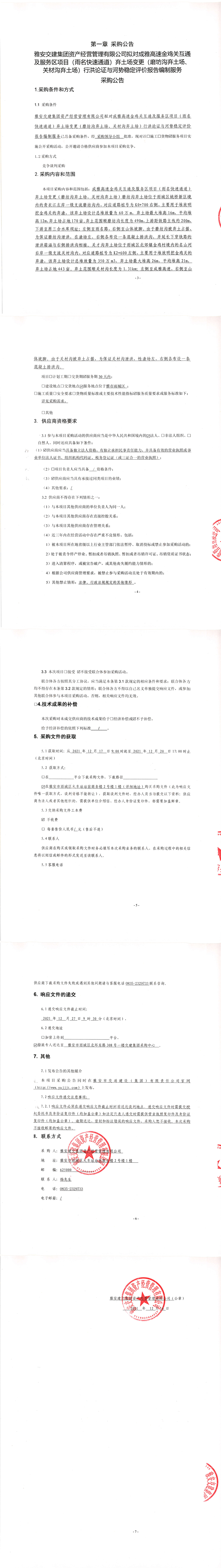 雅安交建集團(tuán)資產(chǎn)經(jīng)營管理有限公司擬對(duì)成雅高速金雞關(guān)互通及服務(wù)區(qū)項(xiàng)目(雨名快速通道)棄土場(chǎng)變更(磨坊溝棄土場(chǎng)、關(guān)材溝棄土場(chǎng))行洪論證與河勢(shì)穩(wěn)定評(píng)價(jià)報(bào)告編制服務(wù)采購公告