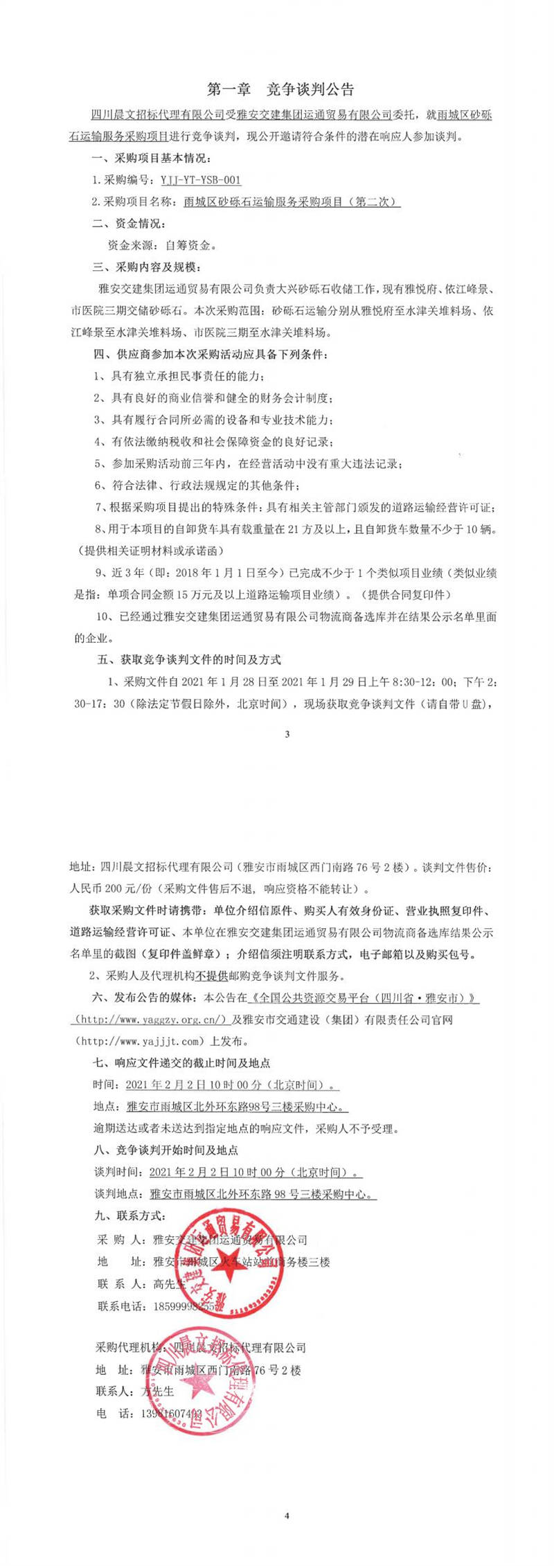 雅安交建集團(tuán)運(yùn)通貿(mào)易有限公司雨城區(qū)砂礫石運(yùn)輸服務(wù)采購項(xiàng)目(第二次)競爭談判公告
