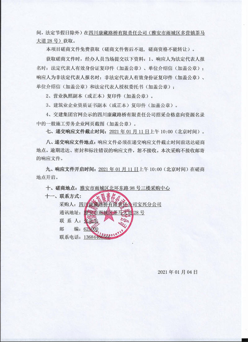 四川康藏路橋有限責(zé)任公司寶興分公司省道432線雅安段擴建工程K19新建拌合站施工勞務(wù)磋商公告(第二次)