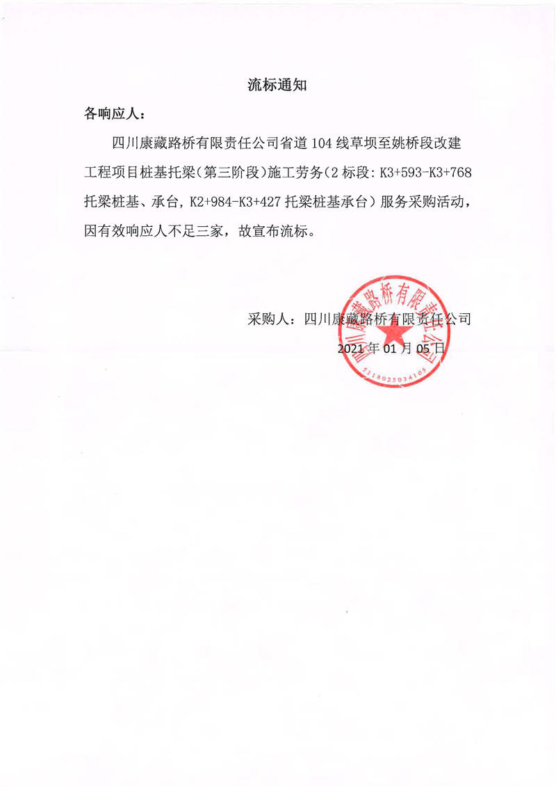 四川康藏路橋有限責任公司省道104線草壩至姚橋段改建工程項目樁基托梁(第三階段)施工勞務(wù)服務(wù)2標段流標通知