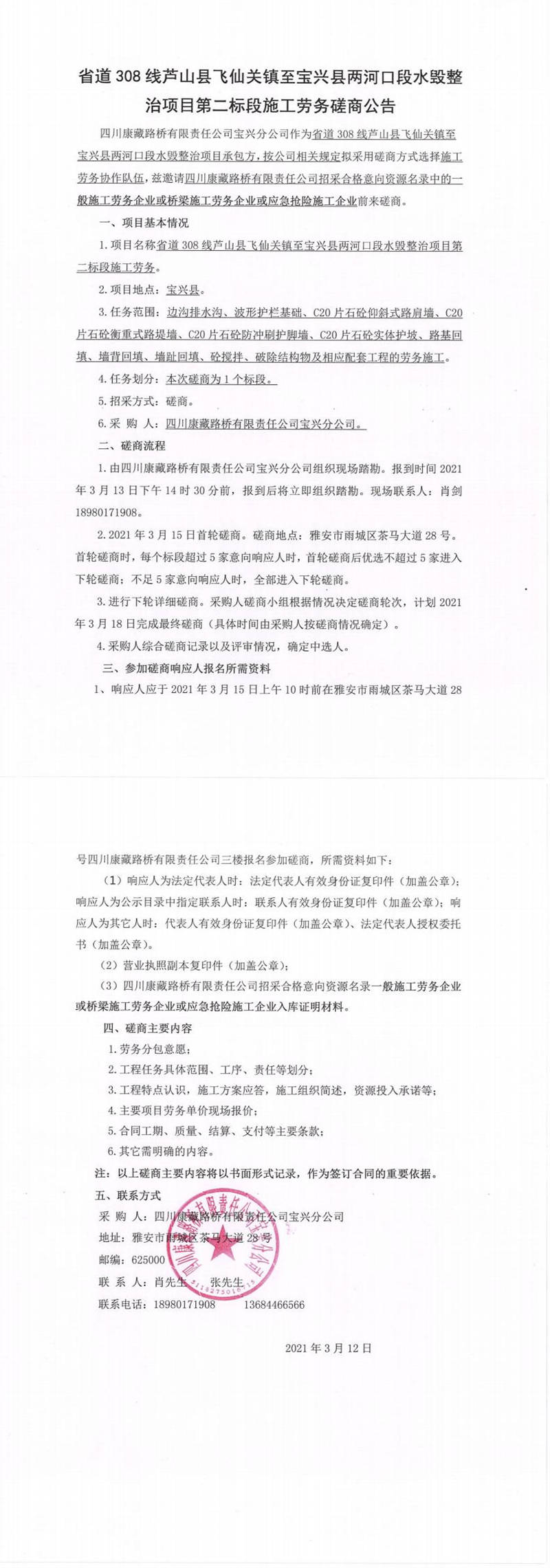 四川康藏路橋有限責任公司寶興分公司省道308線蘆山縣飛仙關(guān)鎮(zhèn)至寶興縣兩河口段水毀整治項目第二標段施工勞務磋商公告
