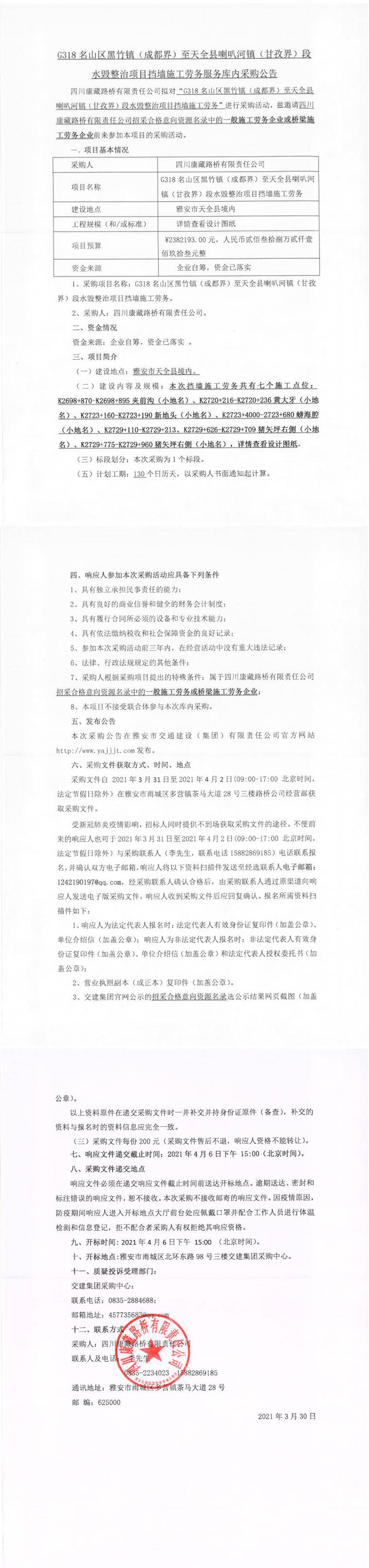 四川康藏路橋有限責任公司G318名山區(qū)黑竹鎮(zhèn)(成都界)至天全縣喇叭河鎮(zhèn)(甘孜界)段水毀整治項目擋墻施工勞務服務庫內(nèi)采購公告