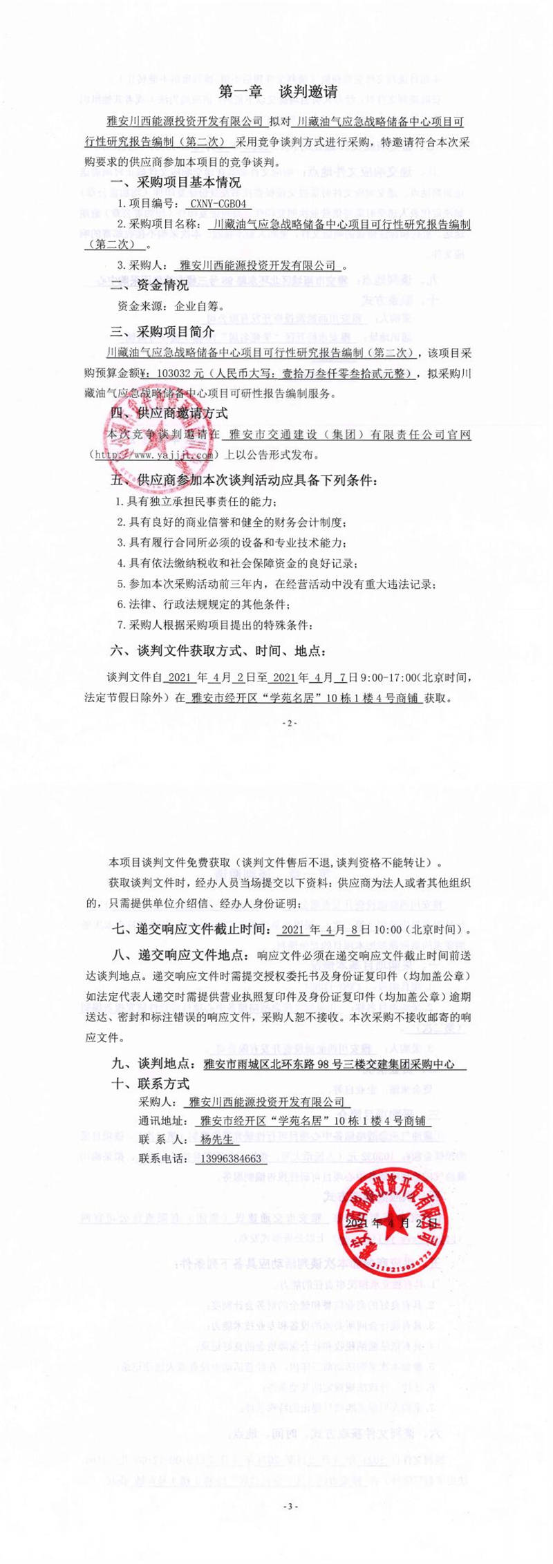 雅安川西能源投資開發(fā)有限公司川藏油氣應急戰(zhàn)略儲備中心項目可行性研究報告編制(第二次)競爭談判公告