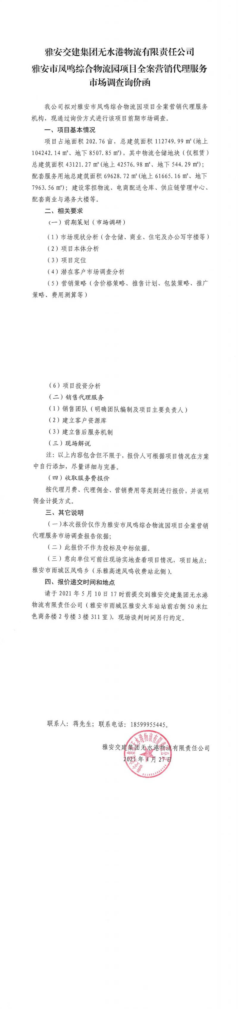 雅安交建集團無水港物流有限責任公司雅安市鳳鳴綜合物流園項目全案營銷代理服務市場調查詢價函
