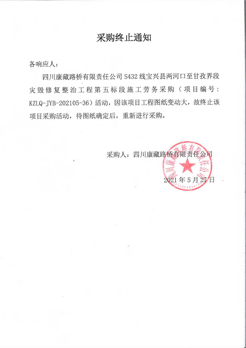 四川康藏路橋有限責任公司S432線寶興縣兩河口至甘孜界段災毀修復整治工程第五標段施工勞務采購終止通知