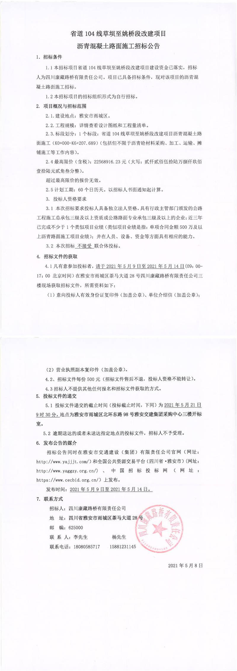 四川康藏路橋有限責任公司省道104線草壩至姚橋段改建項目瀝青混凝土路面施工招標公告