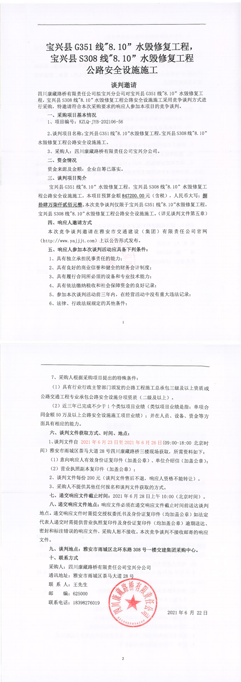 寶興縣G351線“8.10”水毀修復工程,寶興縣S308線“8.10”水毀修復工程公路安全設(shè)施施工競爭談判公告