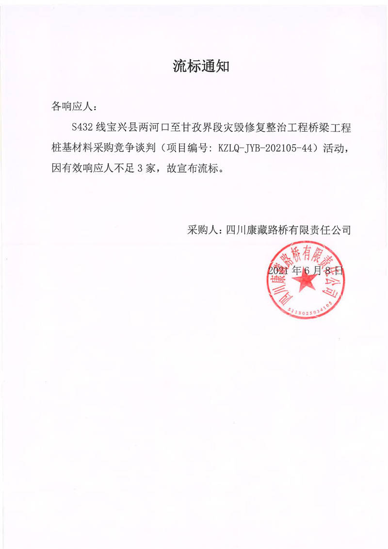 四川康藏路橋有限責(zé)任公司S432線寶興縣兩河口至甘孜界段災(zāi)毀修復(fù)整治工程橋梁工程樁基材料采購(gòu)競(jìng)爭(zhēng)談判流標(biāo)通知