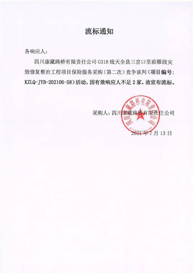 四川康藏路橋有限責(zé)任公司G318線天全縣三岔口至前雕段災(zāi)毀修復(fù)整治工程項目保險服務(wù)采購(第二次)流標(biāo)通知