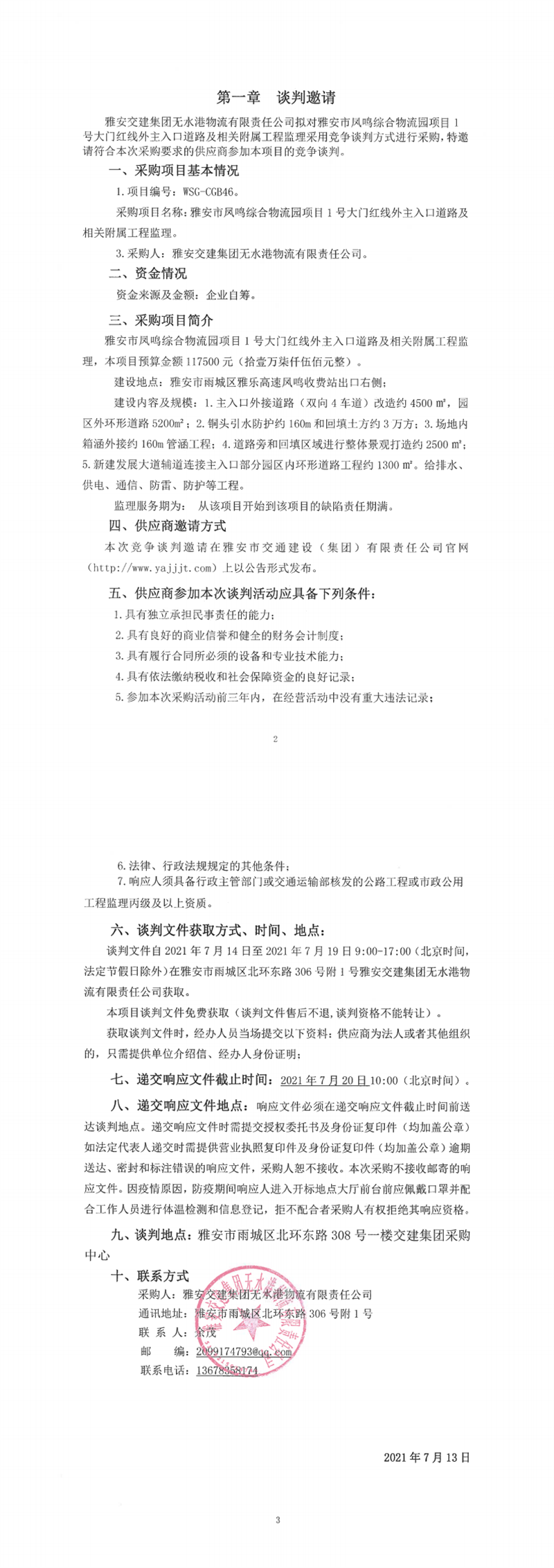雅安交建集團(tuán)無水港物流有限責(zé)任公司雅安市鳳鳴綜合物流園項目1號大門紅線外主入口道路及相關(guān)附屬工程監(jiān)理競爭談判公告