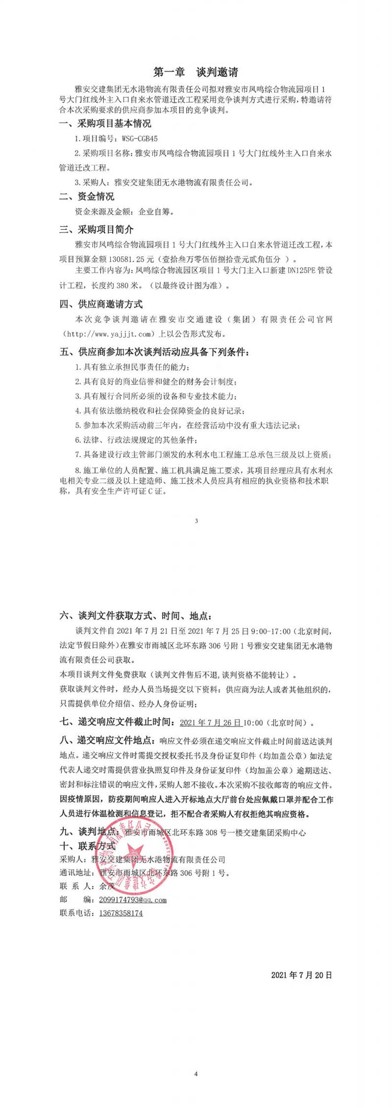 雅安交建集團(tuán)無水港物流有限責(zé)任公司雅安市鳳鳴綜合物流園項(xiàng)目1號大門紅線外主入口自來水管道遷改工程競爭談判公告