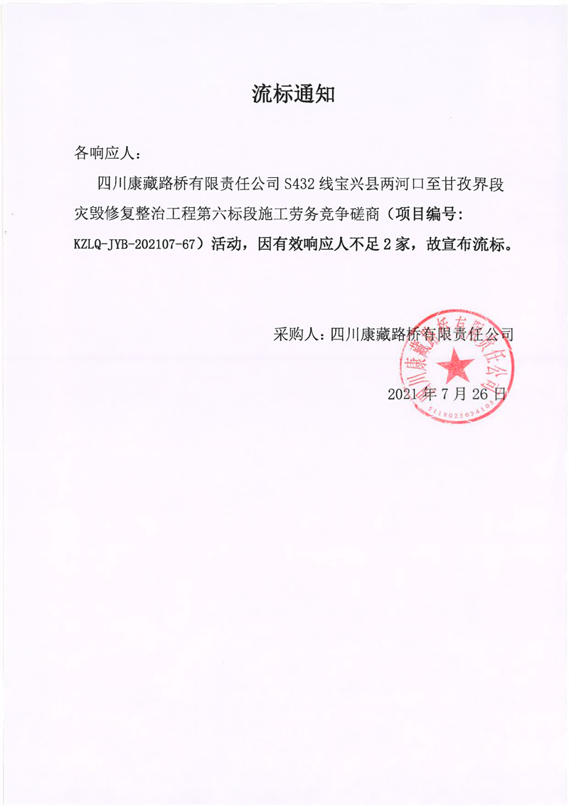 四川康藏路橋有限責(zé)任公司S432線(xiàn)寶興縣兩河口至甘孜界段災(zāi)毀修復(fù)整治工程第六標(biāo)段施工勞務(wù)競(jìng)爭(zhēng)磋商流標(biāo)通知