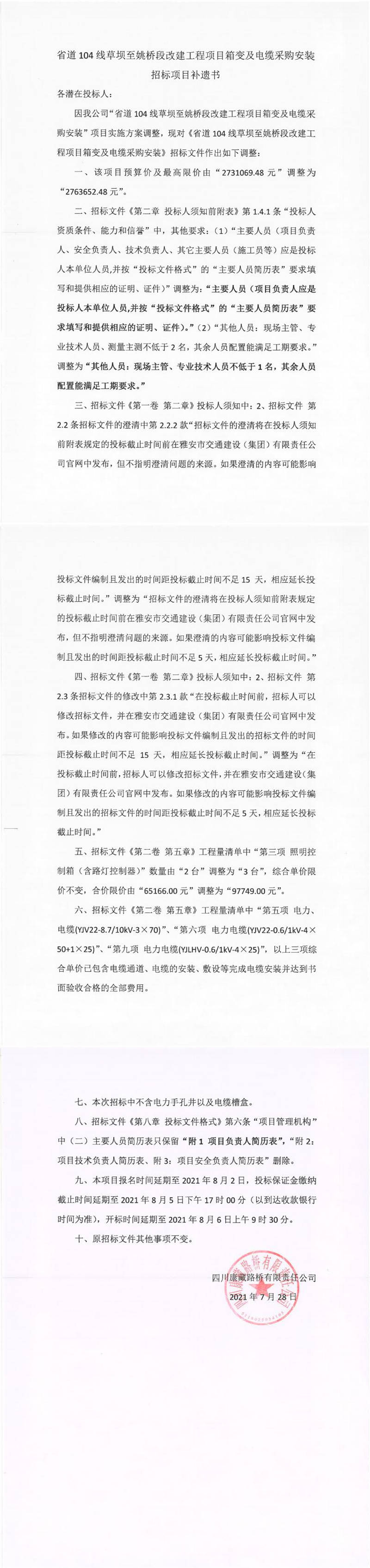 四川康藏路橋有限責(zé)任公司省道104線草壩至姚橋段改建項目箱變及電纜采購安裝招標項目補遺書