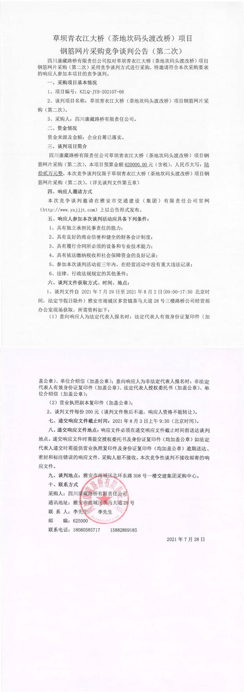 四川康藏路橋有限責(zé)任公司草壩青衣江大橋(茶地坎碼頭渡改橋)項目鋼筋網(wǎng)片采購競爭談判公告(第二次)