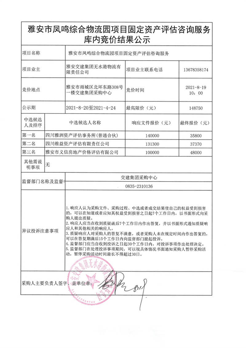雅安交建集團(tuán)無水港物流有限責(zé)任公司雅安市鳳鳴綜合物流園項(xiàng)目固定資產(chǎn)評估咨詢服務(wù)庫內(nèi)競價結(jié)果公示