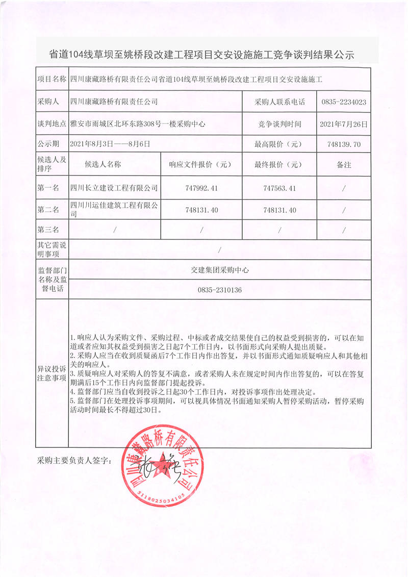 四川康藏路橋有限責任公司省道104線草壩至姚橋段改建工程項目交安設施施工競爭談判結果公示