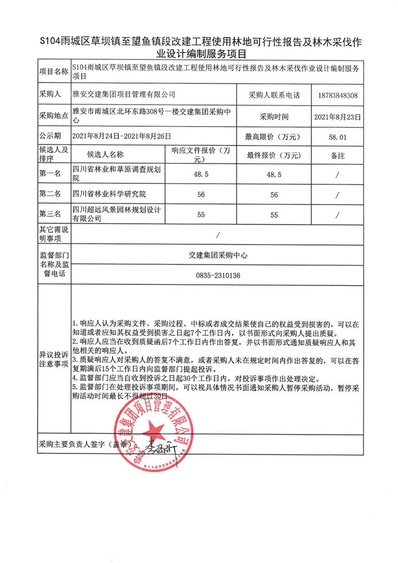 雅安交建集團(tuán)項(xiàng)目管理有限公司S104雨城區(qū)草壩鎮(zhèn)至望魚鎮(zhèn)段改建工程使用林地可行性報告及林木采伐作業(yè)設(shè)計編制服務(wù)項(xiàng)目評審結(jié)果公示