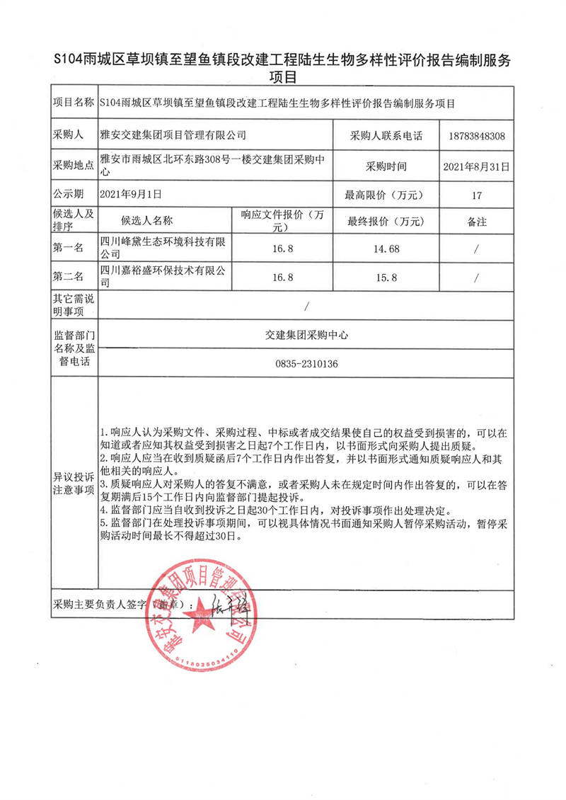 雅安交建集團項目管理有限公司S104雨城區(qū)草壩鎮(zhèn)至望魚鎮(zhèn)段改建工程陸生生物多樣性評價報告編制服務項目評審結果公示