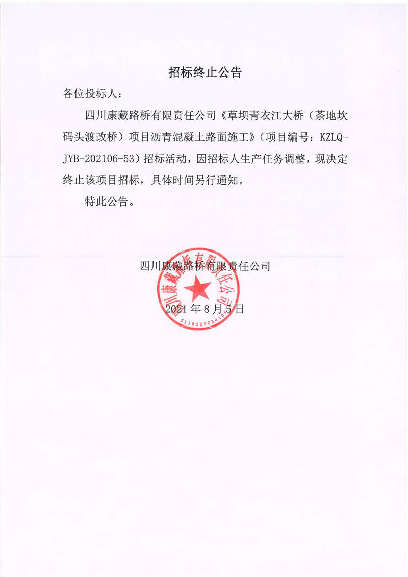 四川康藏路橋有限責(zé)任公司草壩青衣江大橋(茶地坎碼頭渡改橋)項(xiàng)目瀝青混凝土路面施工招標(biāo)終止公告