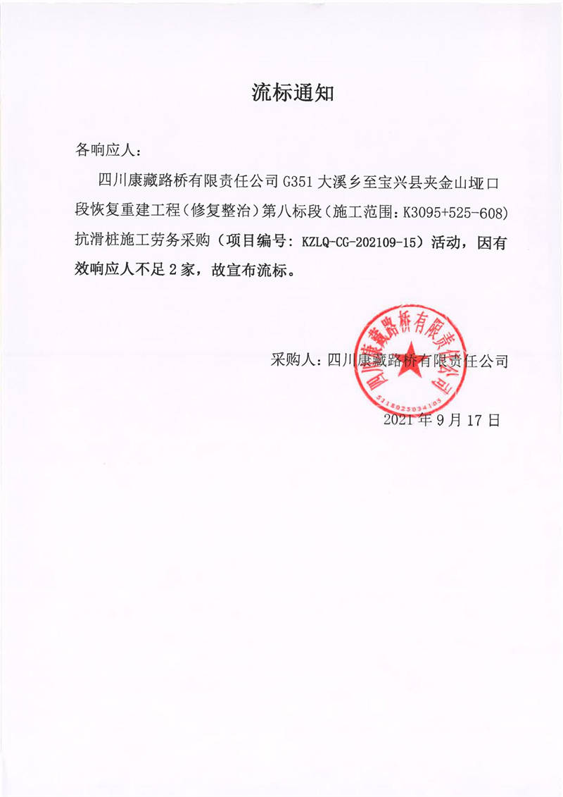 四川康藏路橋有限責(zé)任公司G351大溪鄉(xiāng)至寶興縣夾金山埡口段恢復(fù)重建工程(修復(fù)整治)第八標(biāo)段(施工范圍:K3095+525-608)抗滑樁施工勞務(wù)采購(gòu)流標(biāo)通知
