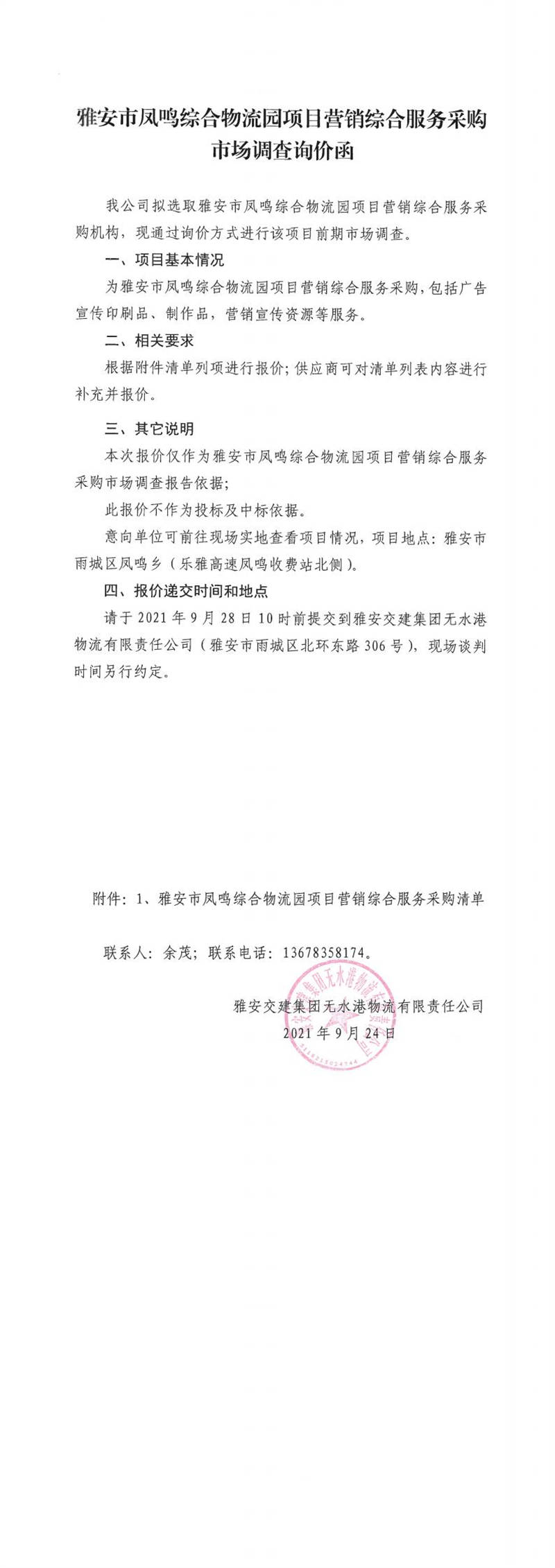 雅安交建集團無水港物流有限責任公司雅安市鳳鳴綜合物流園項目營銷綜合服務采購市場調查詢價函