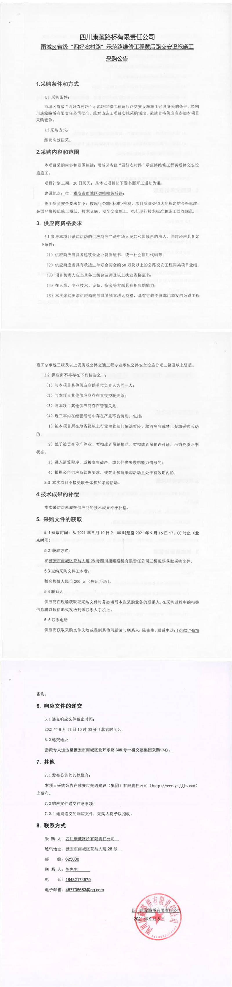 四川康藏路橋有限責(zé)任公司雨城區(qū)省級“四好農(nóng)村路”示范路維修工程黃后路交安設(shè)施施工采購公告