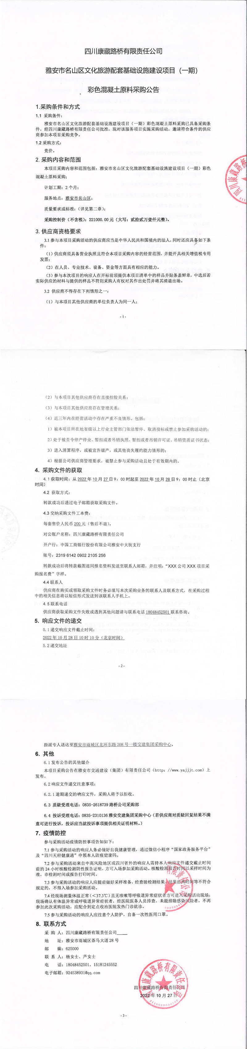 四川康藏路橋有限責(zé)任公司雅安市名山區(qū)文化旅游配套基礎(chǔ)設(shè)施建設(shè)項目(一期)彩色混凝土原料采購公告