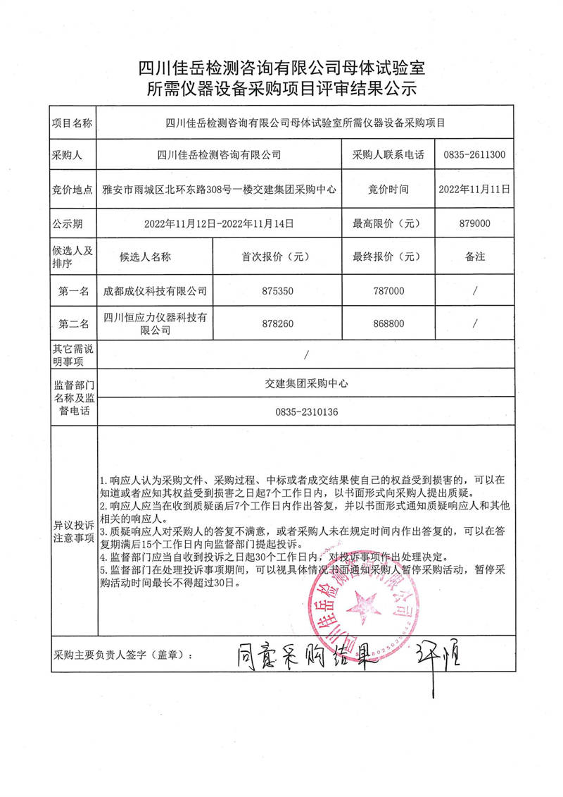 四川佳岳檢測咨詢有限公司母體試驗室所需儀器設備采購項目評審結(jié)果公示
