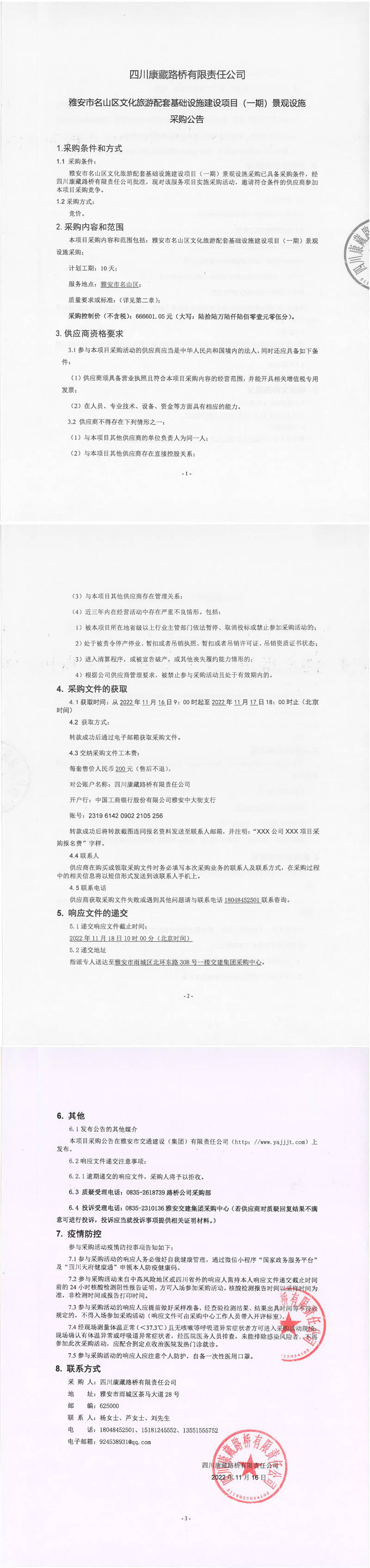 四川康藏路橋有限責(zé)任公司雅安市名山區(qū)文化旅游配套基礎(chǔ)設(shè)施建設(shè)項目(一期)景觀設(shè)施采購公告