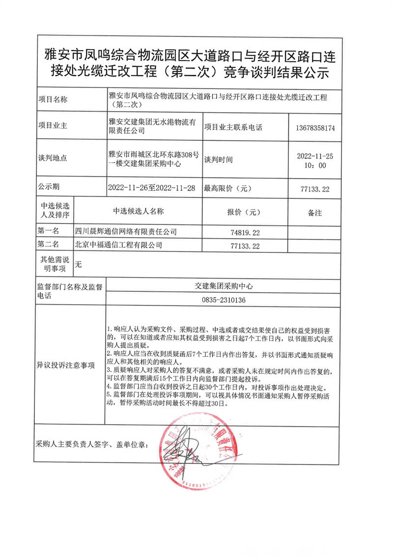雅安交建集團無水港物流有限責(zé)任公司雅安市鳳鳴綜合物流園區(qū)大道路口與經(jīng)開區(qū)路口連接處光纜遷改工程(第二次)競爭談判結(jié)果公示