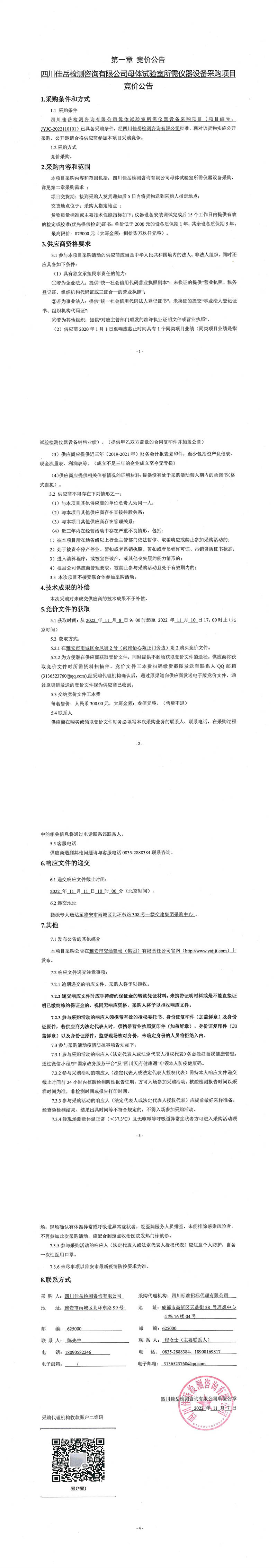 四川佳岳檢測(cè)咨詢有限公司母體試驗(yàn)室所需儀器設(shè)備采購項(xiàng)目采購公告