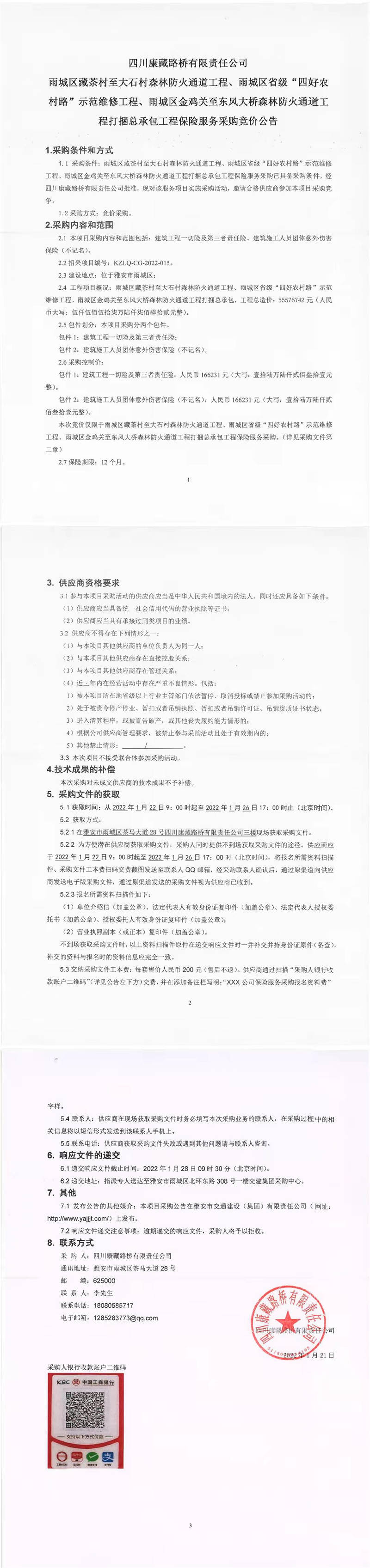 四川康藏路橋有限責(zé)任公司雨城區(qū)藏茶村至大石村森林防火通道工程、雨城區(qū)省級(jí)“四好農(nóng)村路”示范維修工程、雨城區(qū)金雞關(guān)至東風(fēng)大橋森林防火通道工程打捆總承包工程保險(xiǎn)服務(wù)采購競(jìng)價(jià)公告