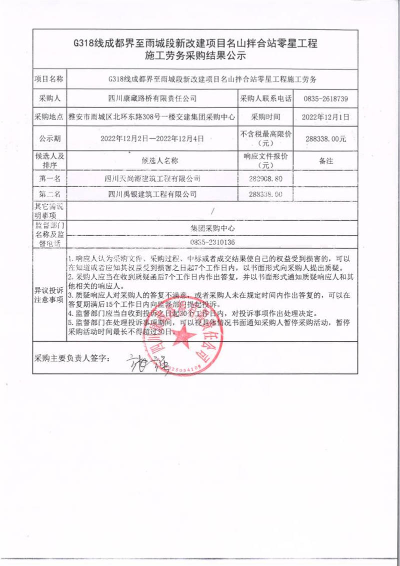 四川康藏路橋有限責(zé)任公司G318線成都界至雨城段新改建項(xiàng)目名山拌合站零星工程施工勞務(wù)采購結(jié)果公示