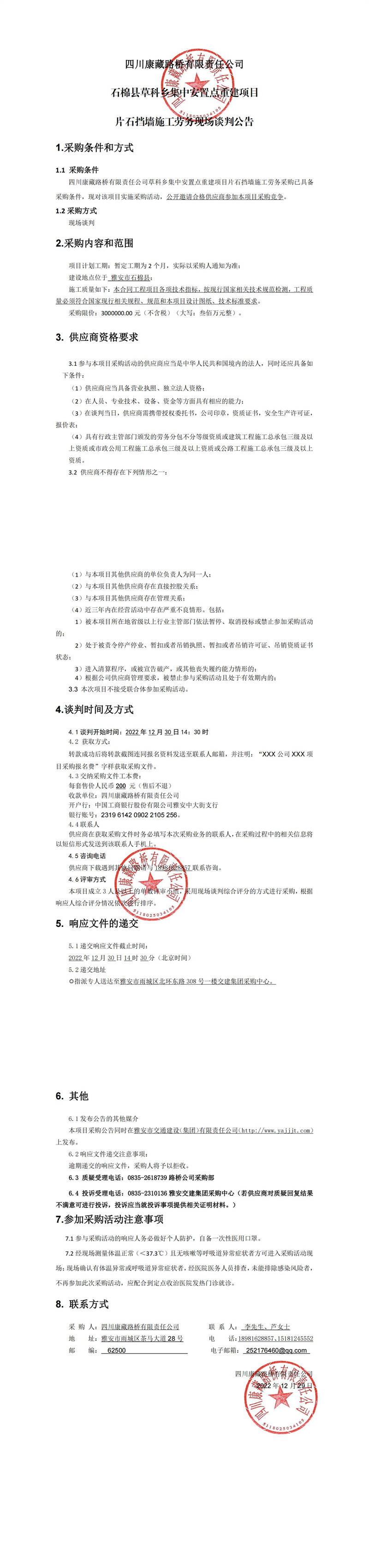四川康藏路橋有限責(zé)任公司石棉縣草科鄉(xiāng)集中安置點(diǎn)重建項(xiàng)目片石擋墻施工勞務(wù)現(xiàn)場談判公告