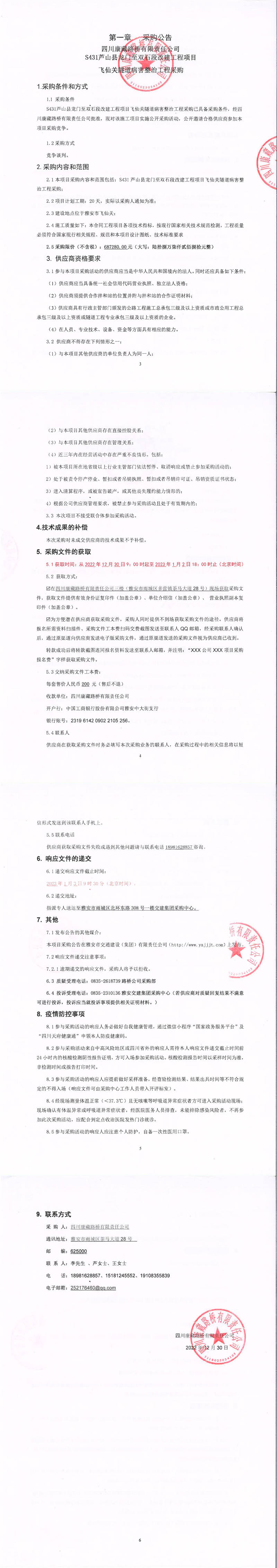 四川康藏路橋有限責(zé)任公司S431蘆山縣龍門至雙石段改建工程項(xiàng)目飛仙關(guān)隧道病害整治工程采購采購公告