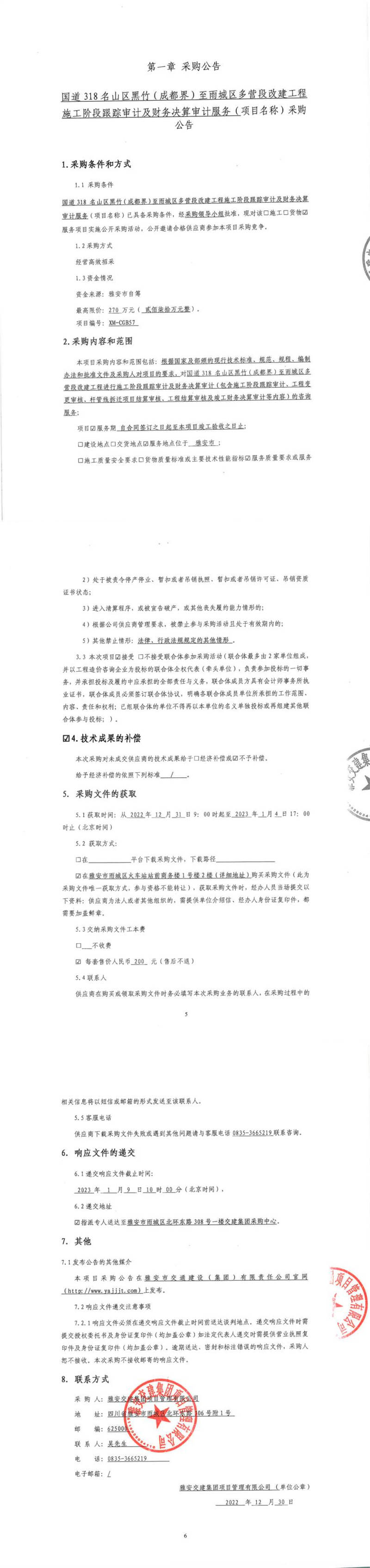 雅安交建集團(tuán)項目管理有限公司國道318名山區(qū)黑竹(成都界)至雨城區(qū)多營段改建工程施工階段跟蹤審計及財務(wù)決算審計服務(wù)采購公告