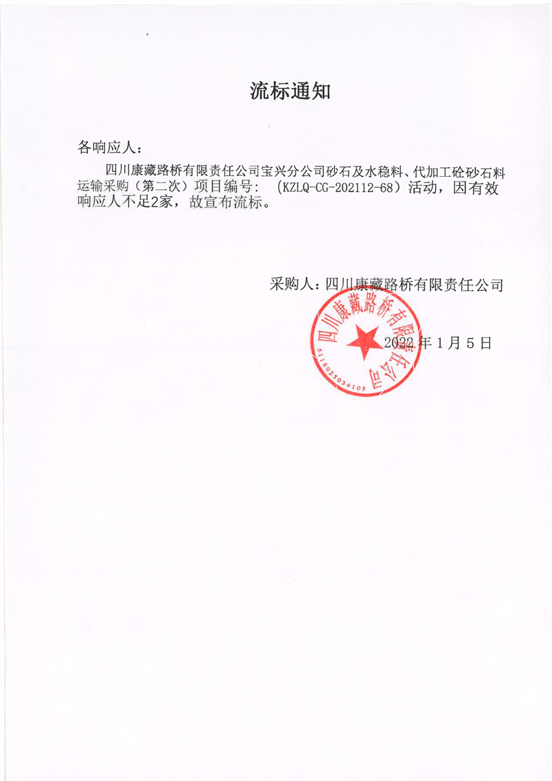 四川康藏路橋有限責(zé)任公司寶興分公司砂石及水穩(wěn)料、代加工砼砂石料運輸采購(第二次)流標(biāo)通知