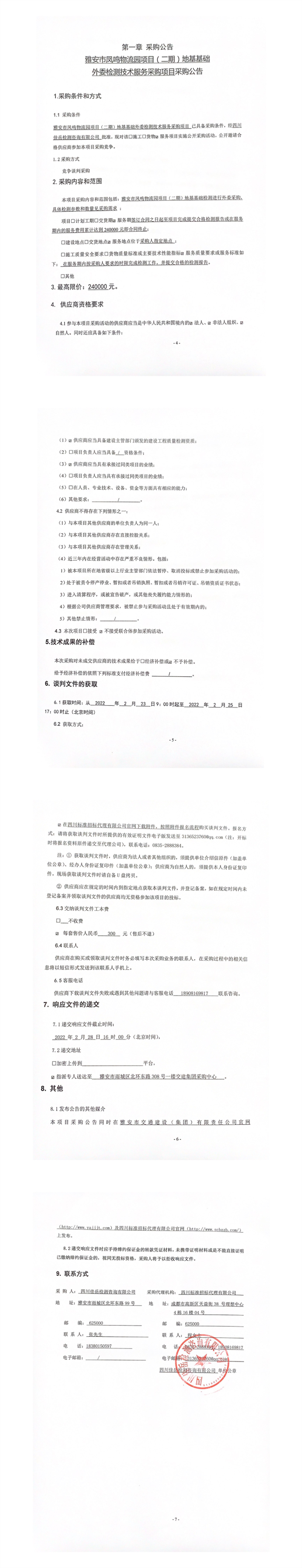 四川佳岳檢測咨詢有限公司雅安市鳳鳴物流園項目(二期)地基基礎(chǔ)外委檢測技術(shù)服務(wù)采購項目采購公告
