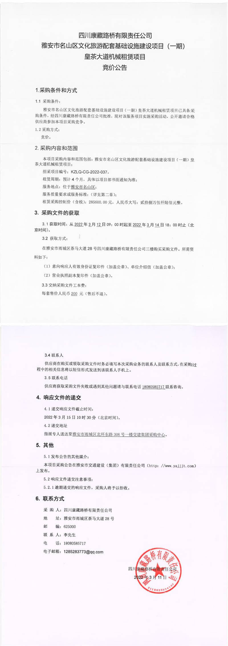 四川康藏路橋有限責(zé)任公司雅安市名山區(qū)文化旅游配套基礎(chǔ)設(shè)施建設(shè)項目(一期)皇茶大道機(jī)械租賃項目競價公告