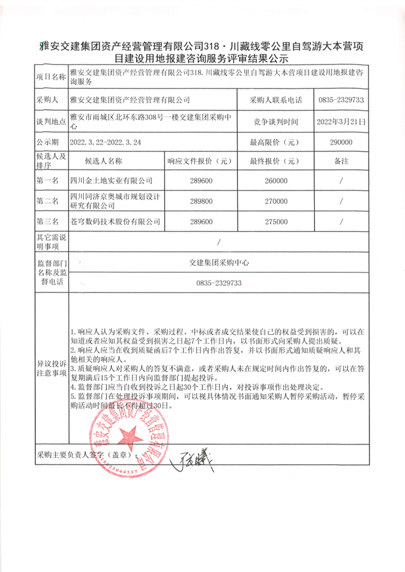 雅安交建集團(tuán)資產(chǎn)經(jīng)營(yíng)管理有限公司318川藏線零公里自駕游大本營(yíng)項(xiàng)目建設(shè)用地報(bào)建咨詢(xún)服務(wù)評(píng)審結(jié)果公示