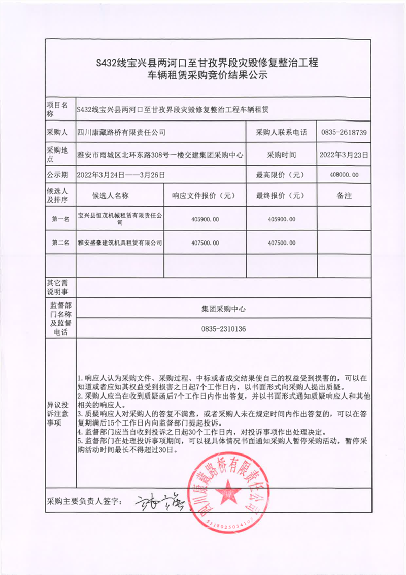 四川康藏路橋有限責(zé)任公司S432線寶興縣兩河口至甘孜界段災(zāi)毀修復(fù)整治工程車輛租賃采購競價結(jié)果公示