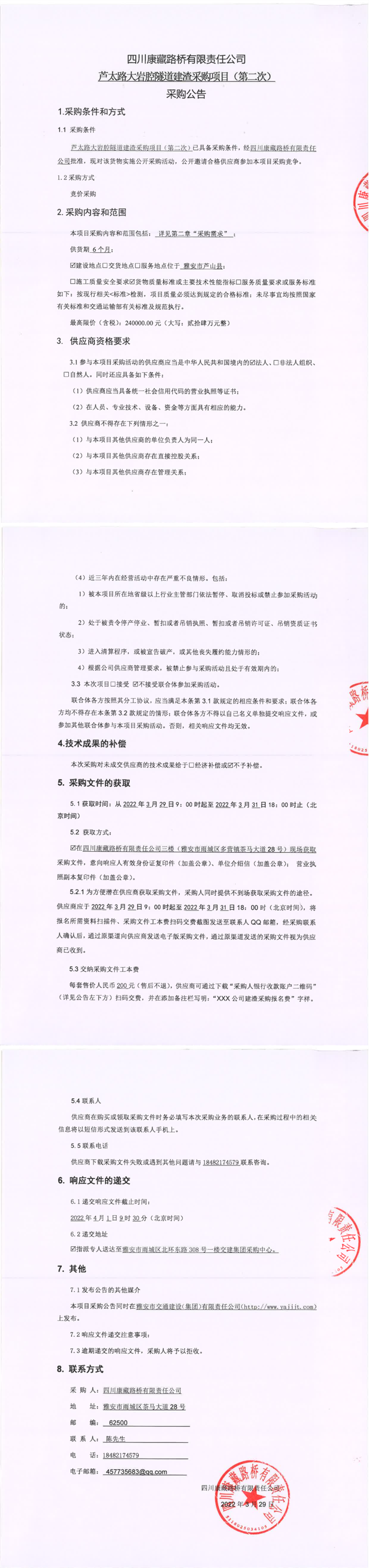 四川康藏路橋有限責(zé)任公司蘆太路大巖腔隧道建渣采購項目(第二次)采購公告